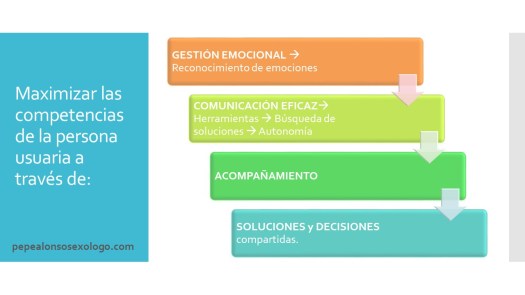 En esta ocasión quisiera compartir con todas y todos un post sobre la metodología desde la que puede enfrentarse el consejo asistido en sexología. Es importante destacar que el principio que rige el consejo asistido supone que todas las personas estamos capacitadas para resolver nuestros problemas, si se nos permite y da la oportunidad de hacerlo con la ayuda necesaria; en este sentido la ayuda es proporcionada por el profesional de la sexología que se responsabiliza de informar y proporcionar herramientas y estrategias, en tanto que la persona usuaria se compromete en su propio cuidado y a través de una participación activa que puede incluir la lectura de libros, artículos, realización de ejercicios en casa y en las sesiones, el visionado de películas, documentales, etc.